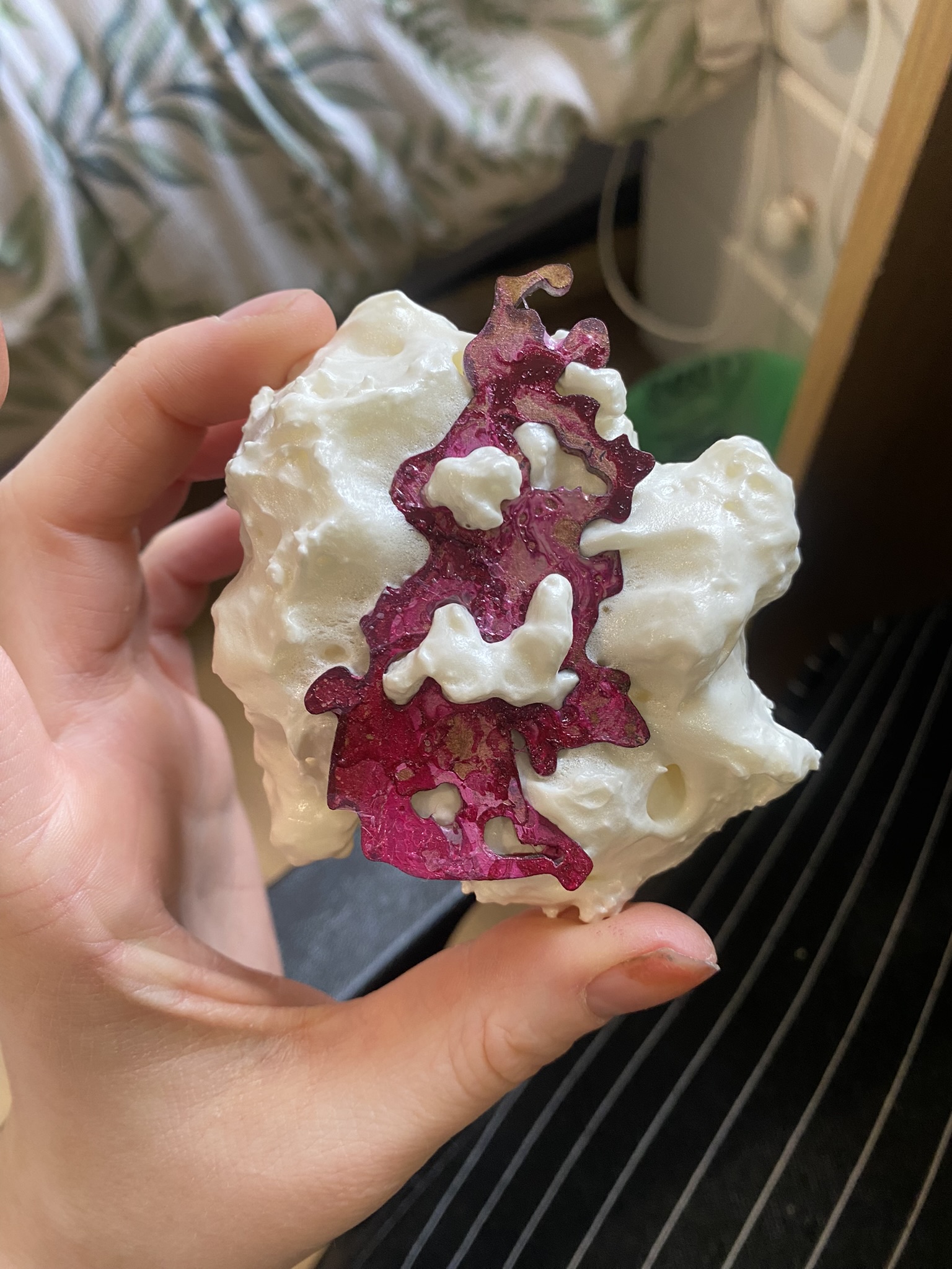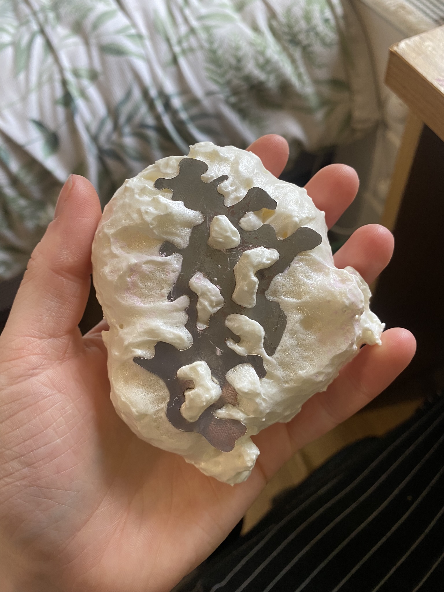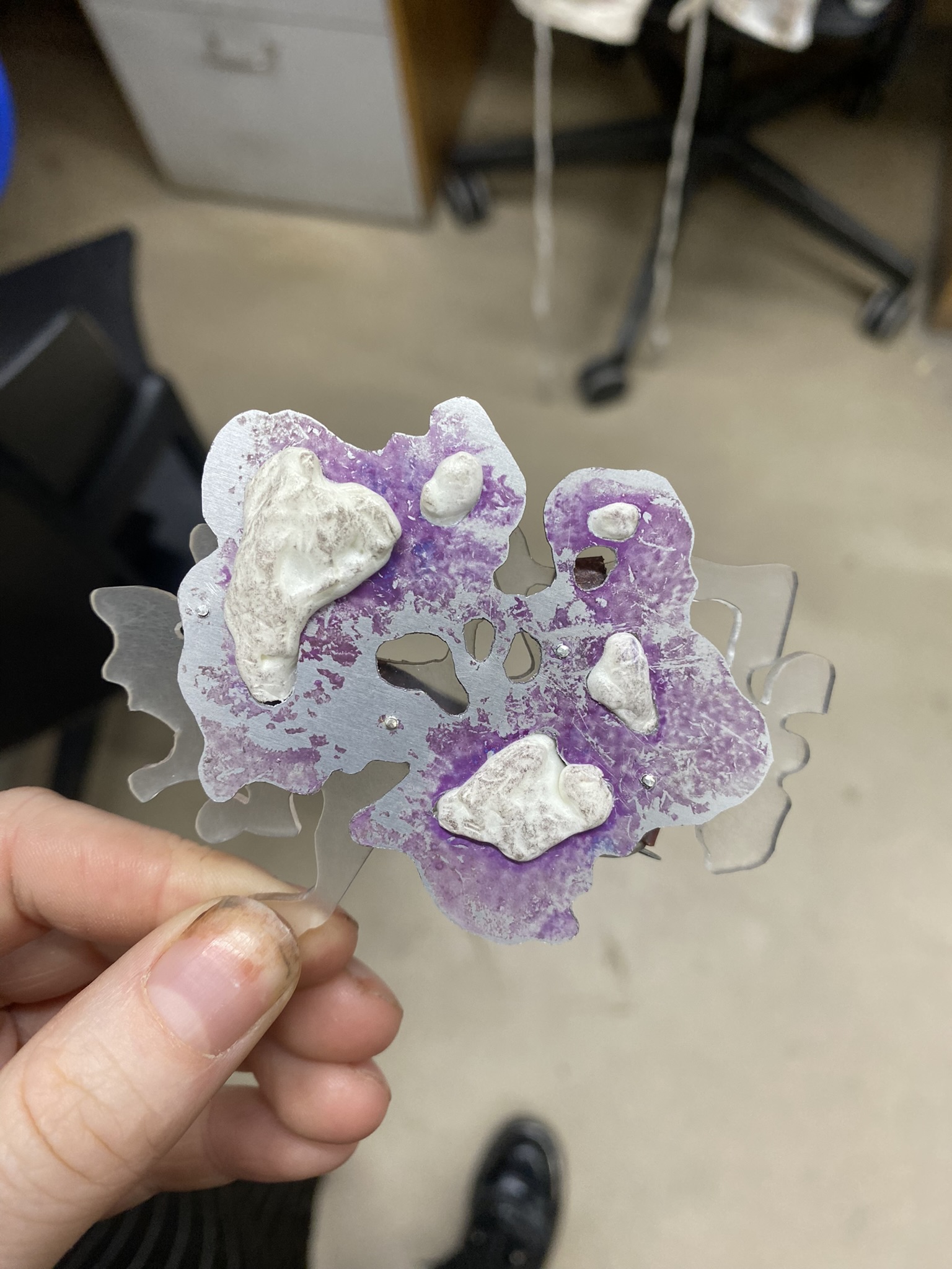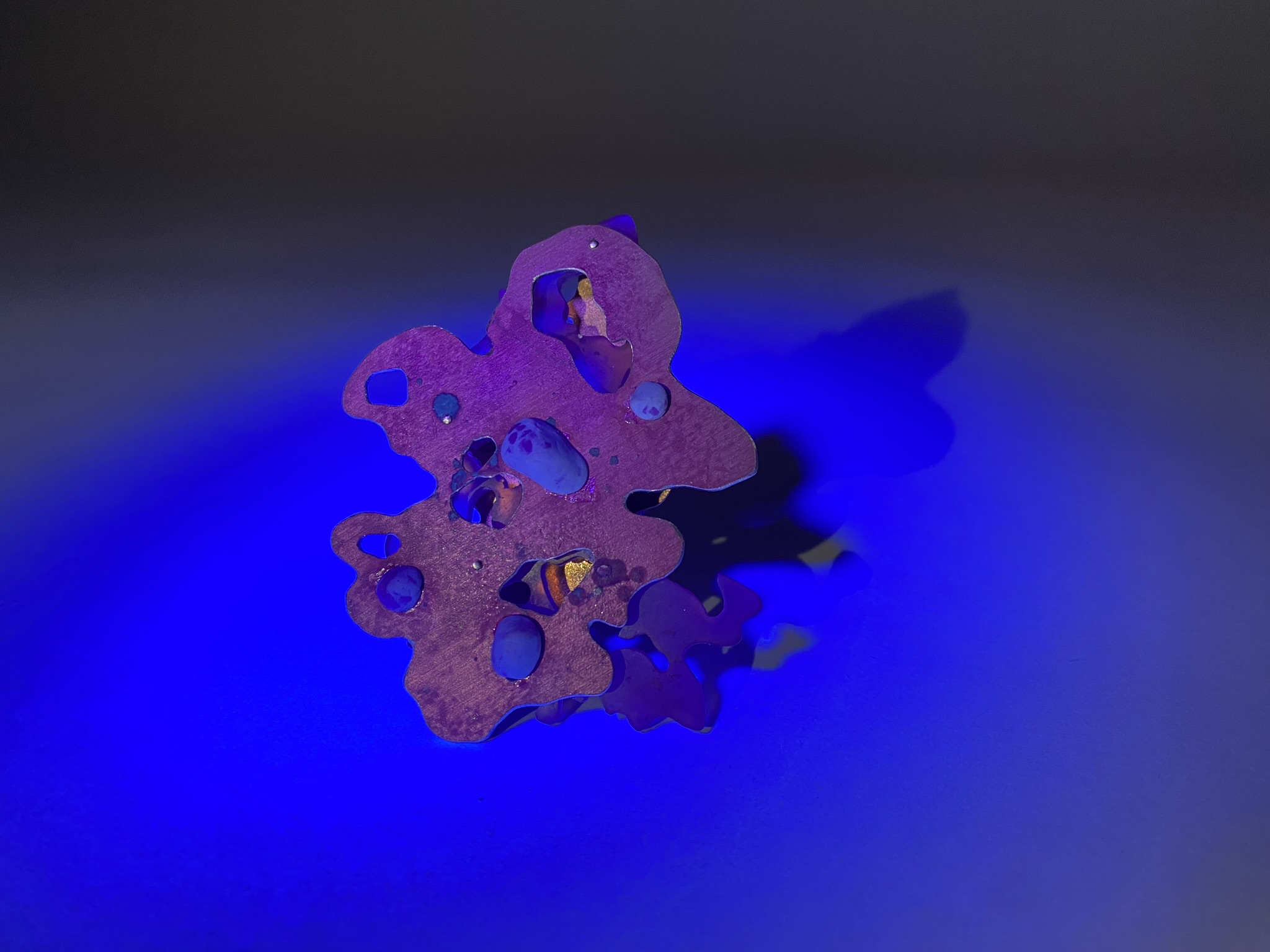 So, over the past couple years I have tried out many different materials, including metals, textiles, resin, ceramics, leaves, inks, paper, wood, plastics, 3D printing filament, bio materials, uv paints, foams and certain clays. But, I have found myself falling in love with photochromic pigments, which are a material that change colour when exposed to sunlight. Through experimentation, I have found that this material mixes really well with certain clays and resins and it can be applied to the surface of aluminium and some other metals. I came across photochromic pigments when I was researching into vitiligo, as this condition can be both triggered and treated by exposure to ultraviolet light, so to visually demonstrate this key feature to the condition I have used photochromics.