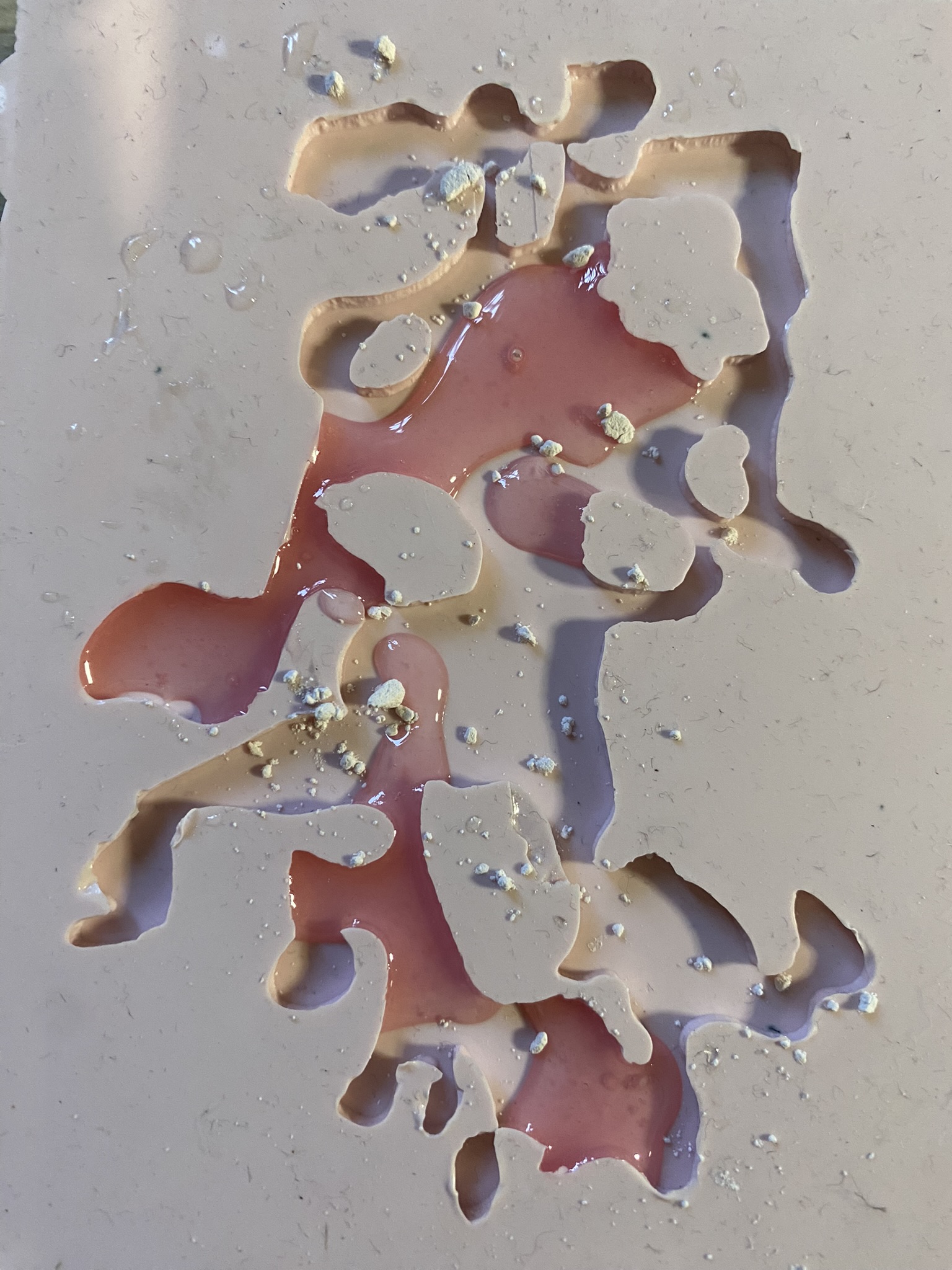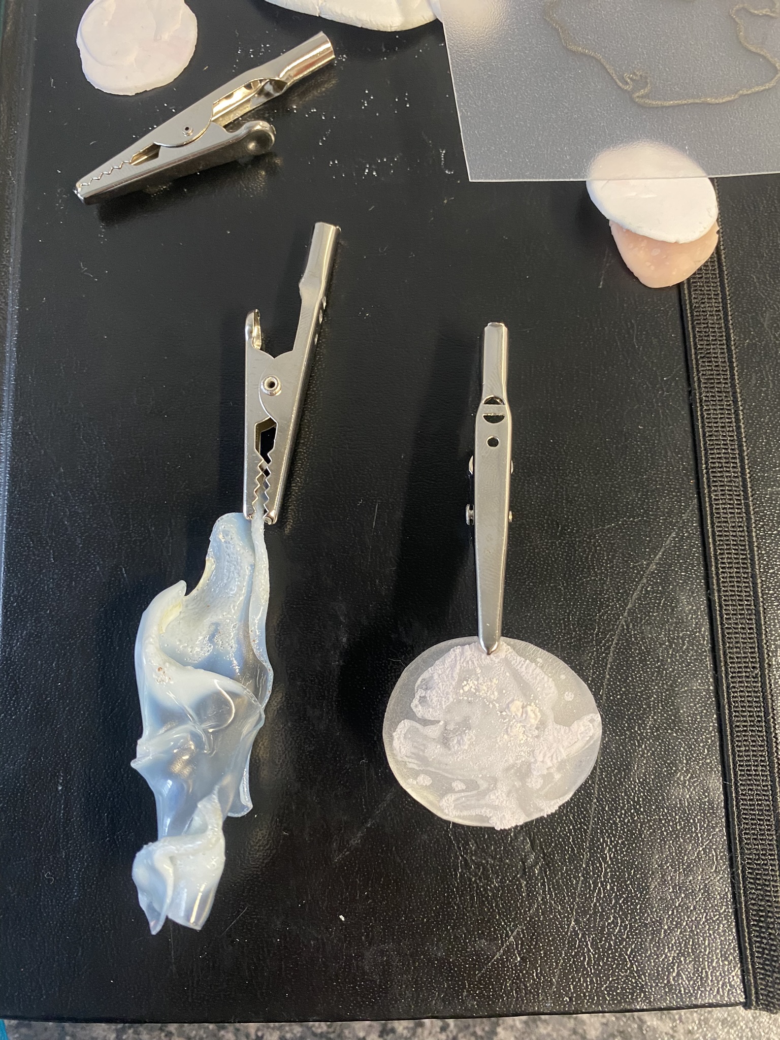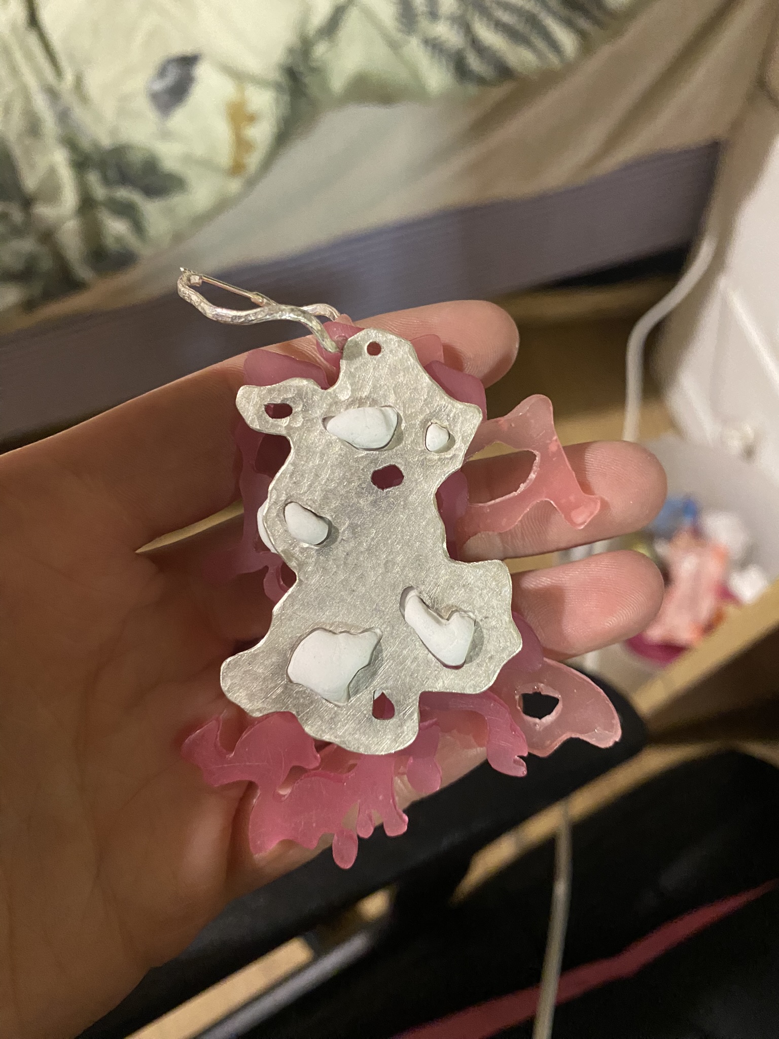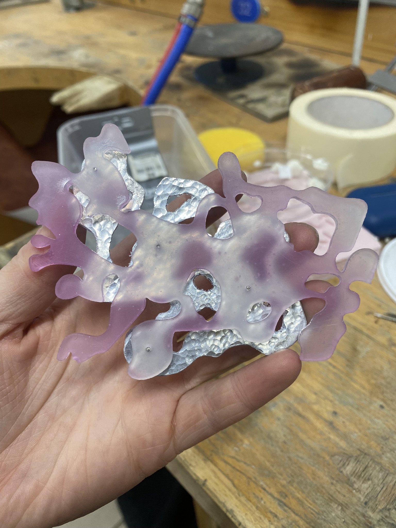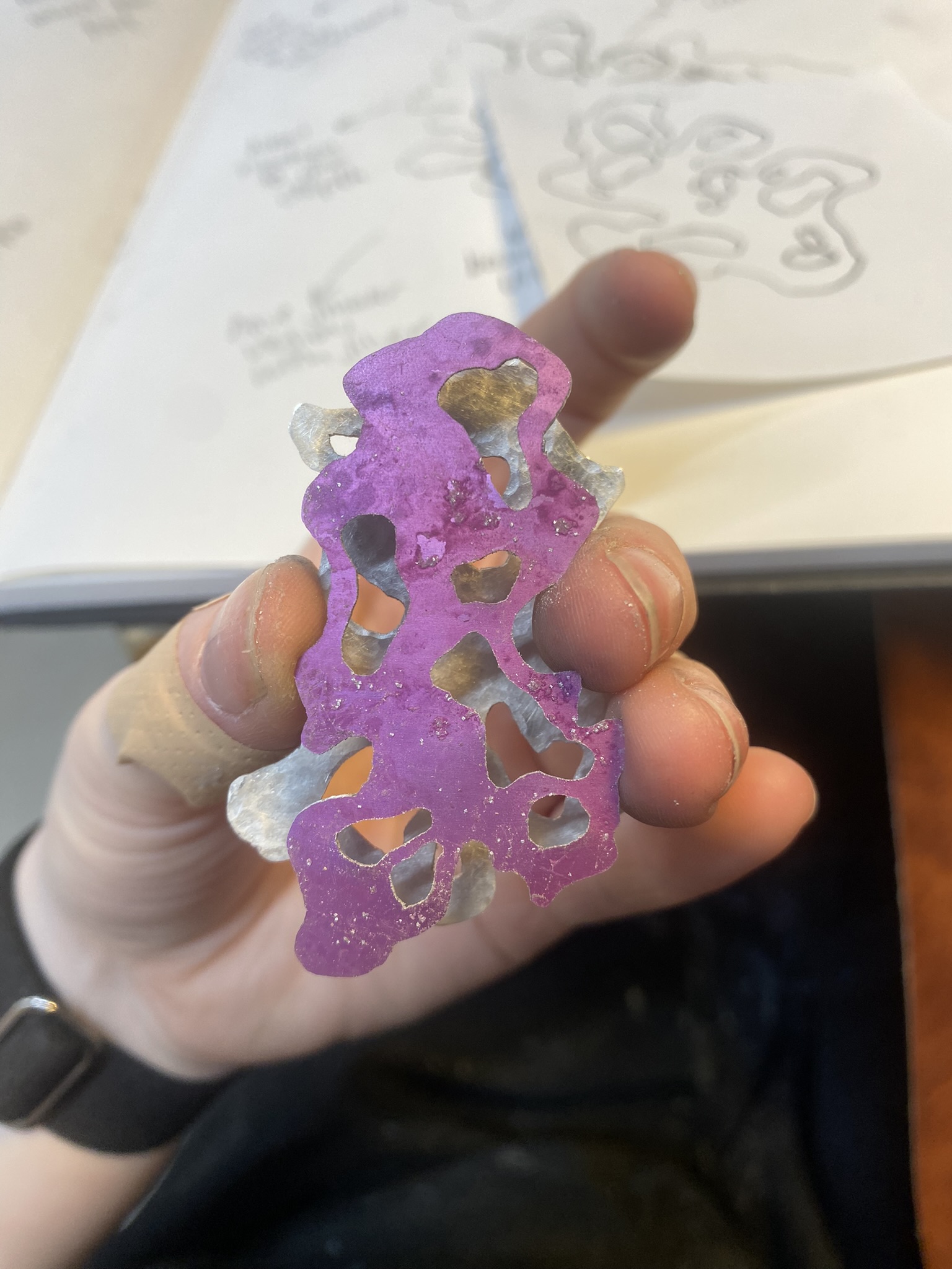 So, over the past couple years I have tried out many different materials, including metals, textiles, resin, ceramics, leaves, inks, paper, wood, plastics, 3D printing filament, bio materials, uv paints, foams and certain clays. But, I have found myself falling in love with photochromic pigments, which are a material that change colour when exposed to sunlight. Through experimentation, I have found that this material mixes really well with certain clays and resins and it can be applied to the surface of aluminium and some other metals. I came across photochromic pigments when I was researching into vitiligo, as this condition can be both triggered and treated by exposure to ultraviolet light, so to visually demonstrate this key feature to the condition I have used photochromics.
