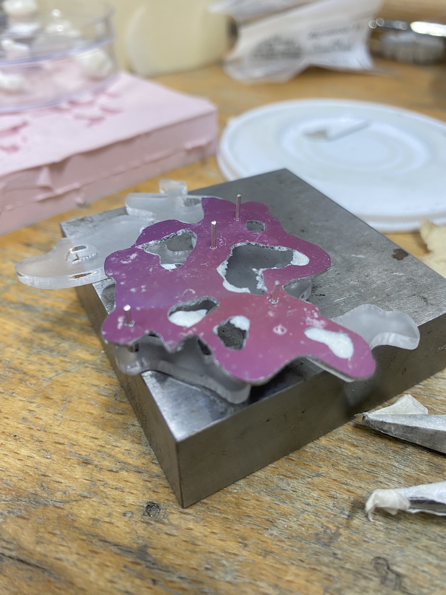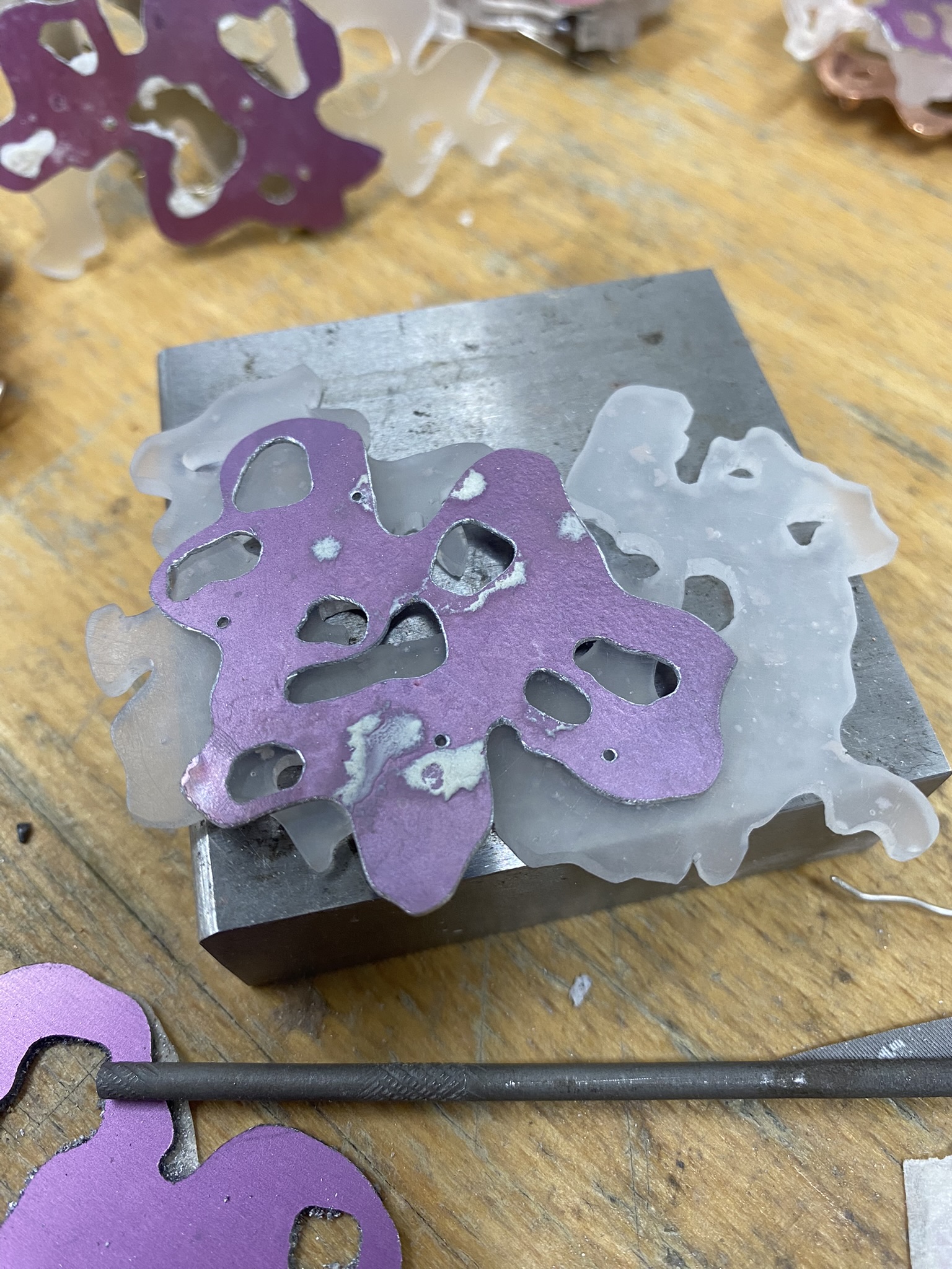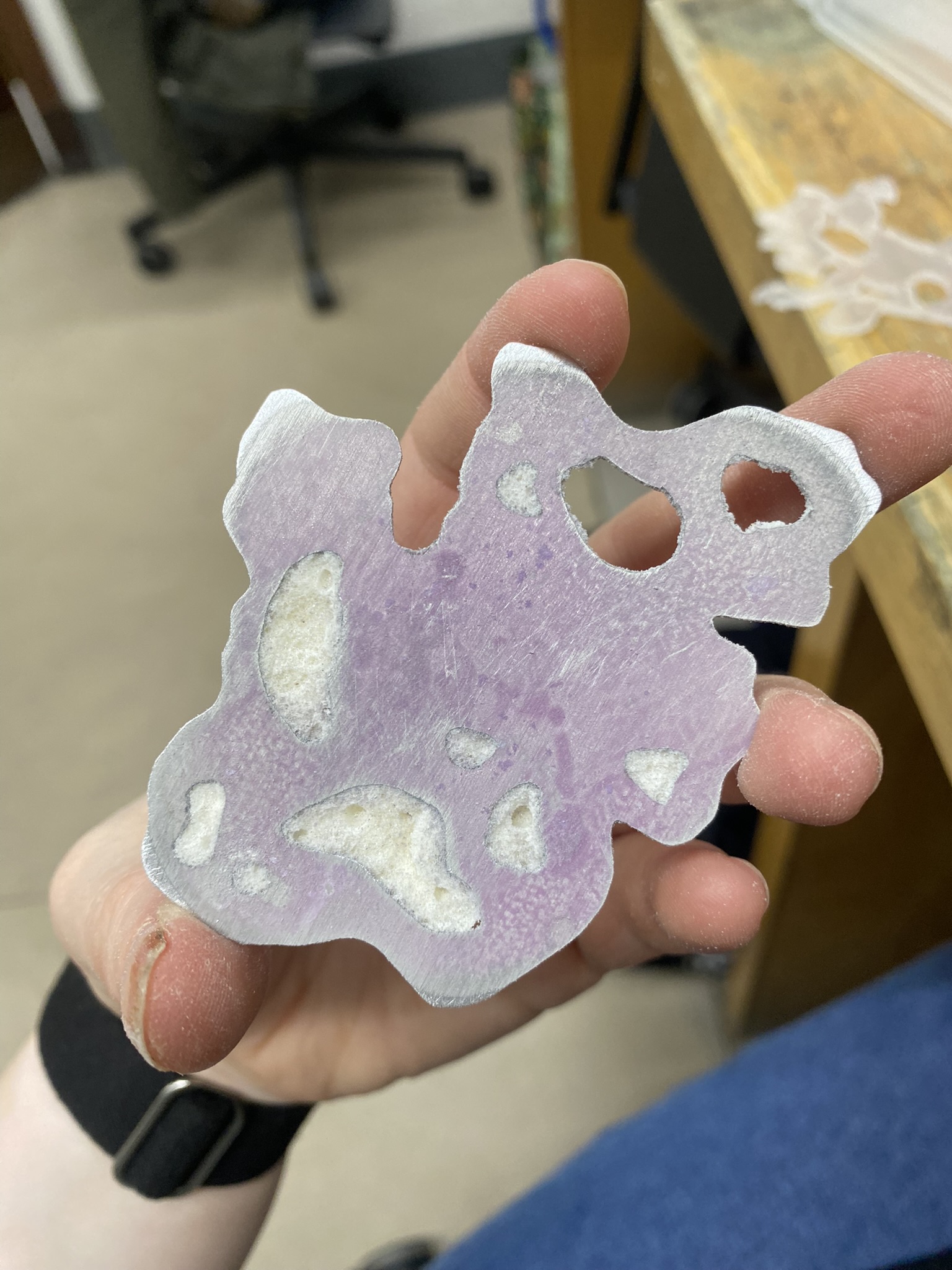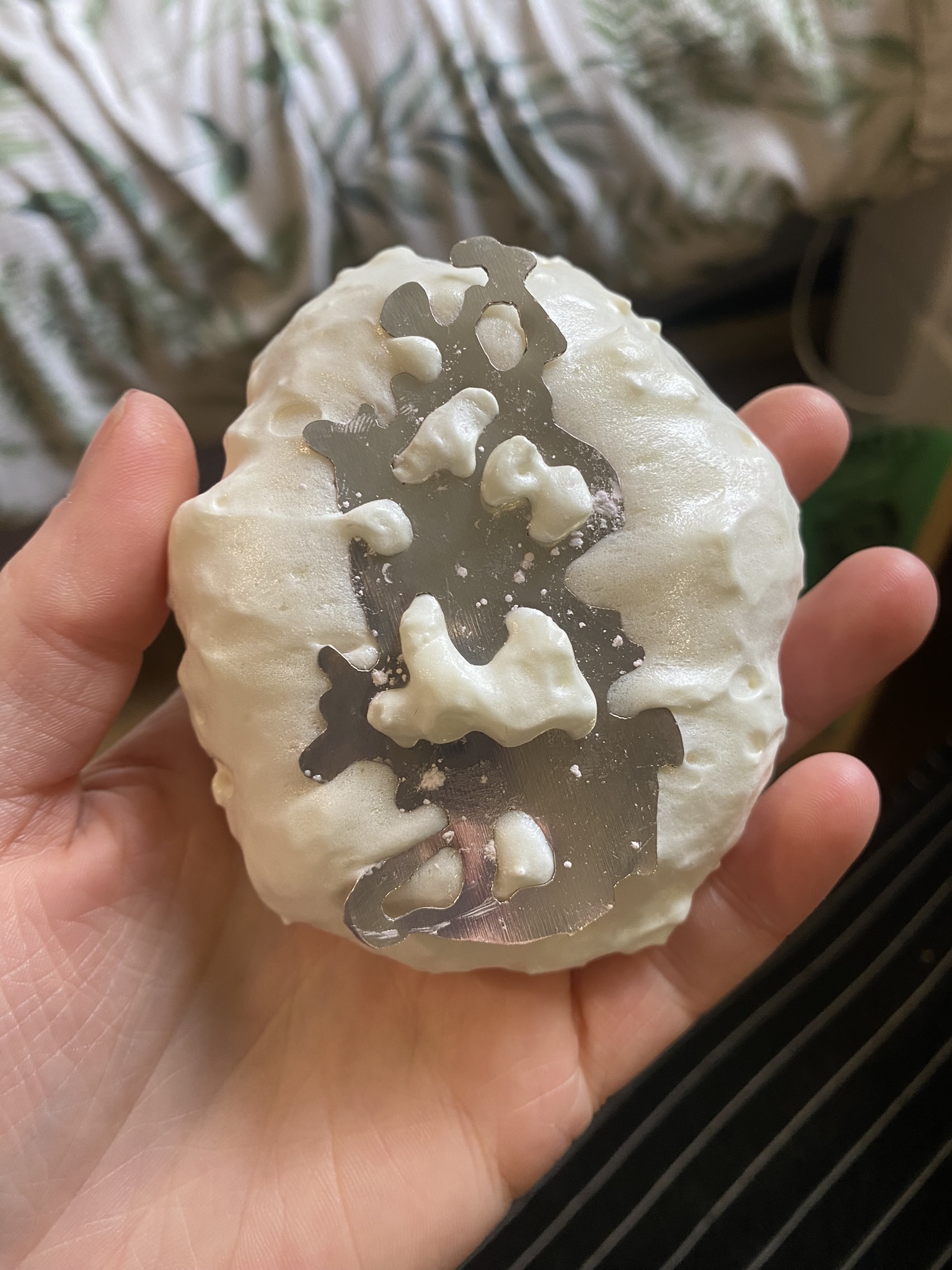 So, over the past couple years I have tried out many different materials, including metals, textiles, resin, ceramics, leaves, inks, paper, wood, plastics, 3D printing filament, bio materials, uv paints, foams and certain clays. But, I have found myself falling in love with photochromic pigments, which are a material that change colour when exposed to sunlight. Through experimentation, I have found that this material mixes really well with certain clays and resins and it can be applied to the surface of aluminium and some other metals. I came across photochromic pigments when I was researching into vitiligo, as this condition can be both triggered and treated by exposure to ultraviolet light, so to visually demonstrate this key feature to the condition I have used photochromics.