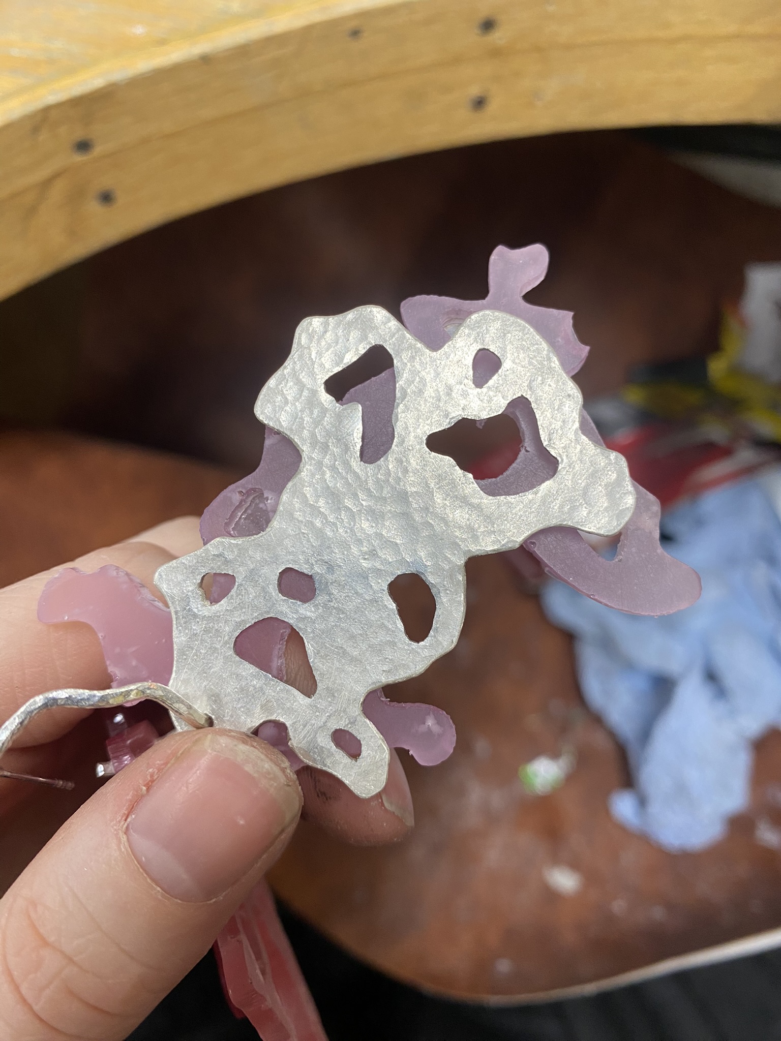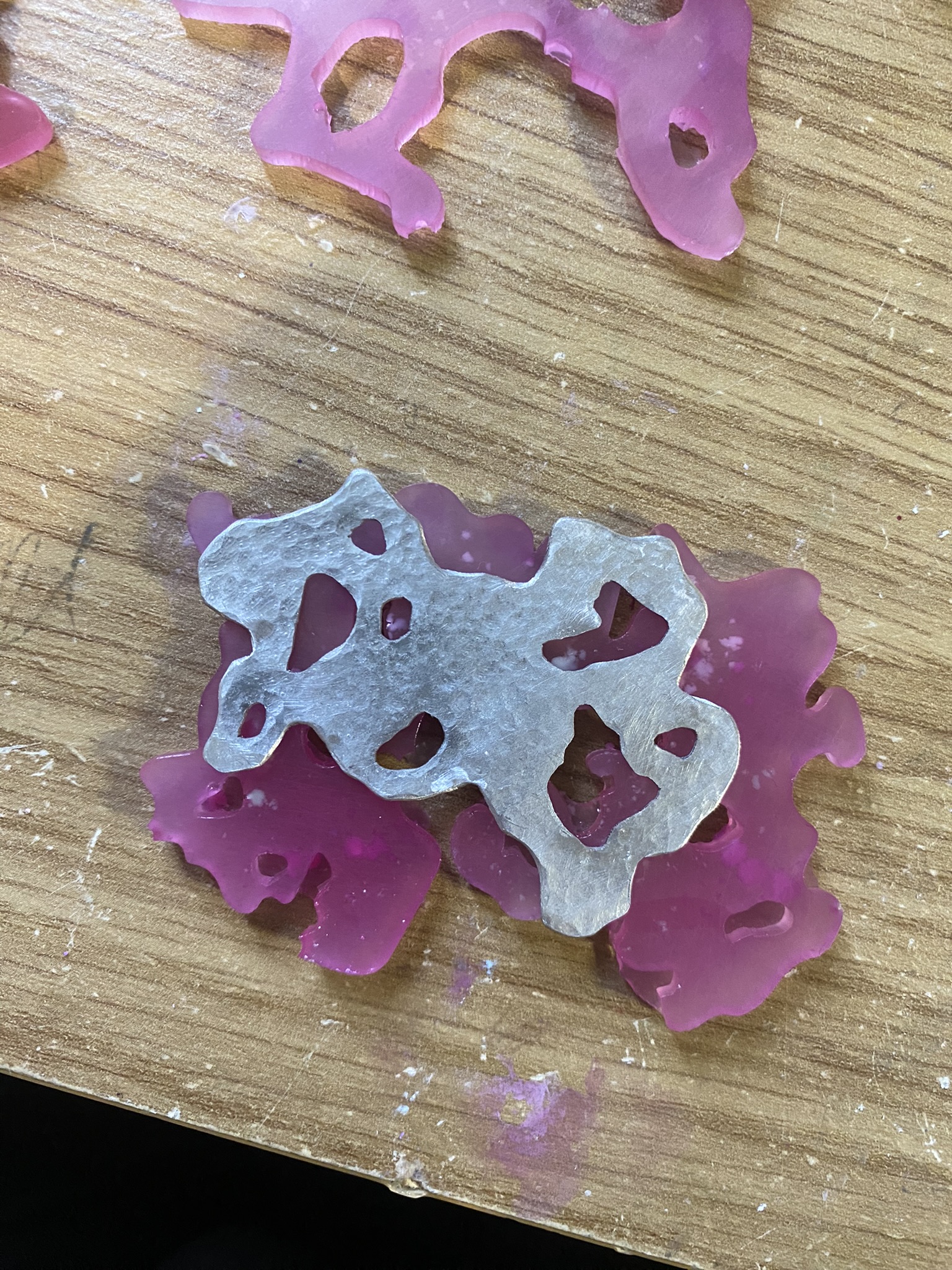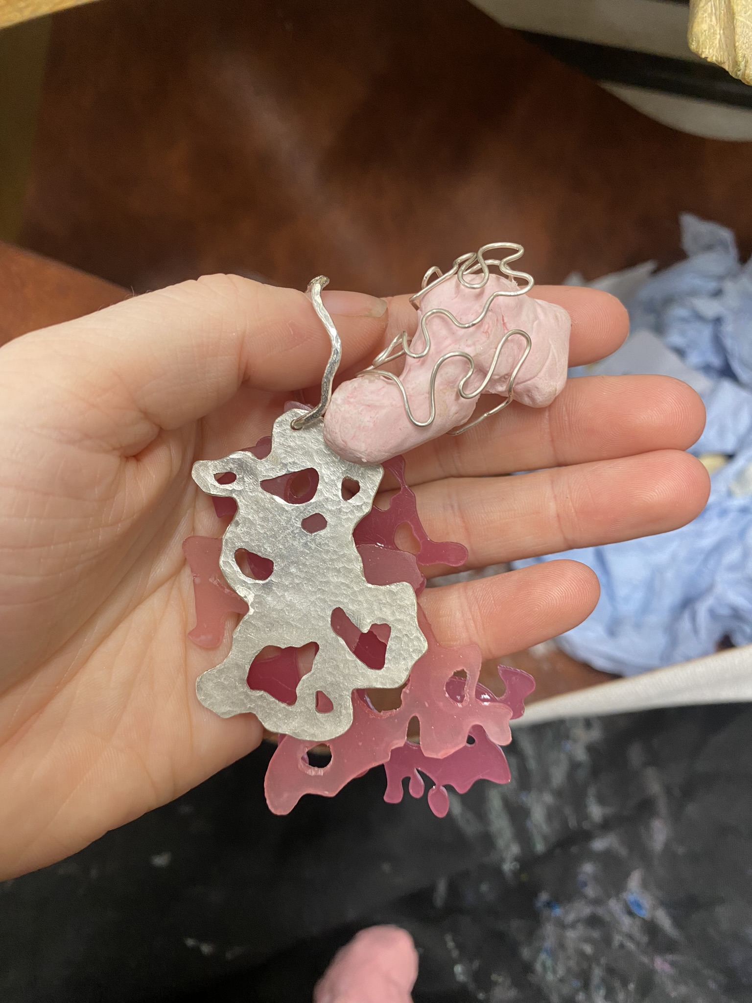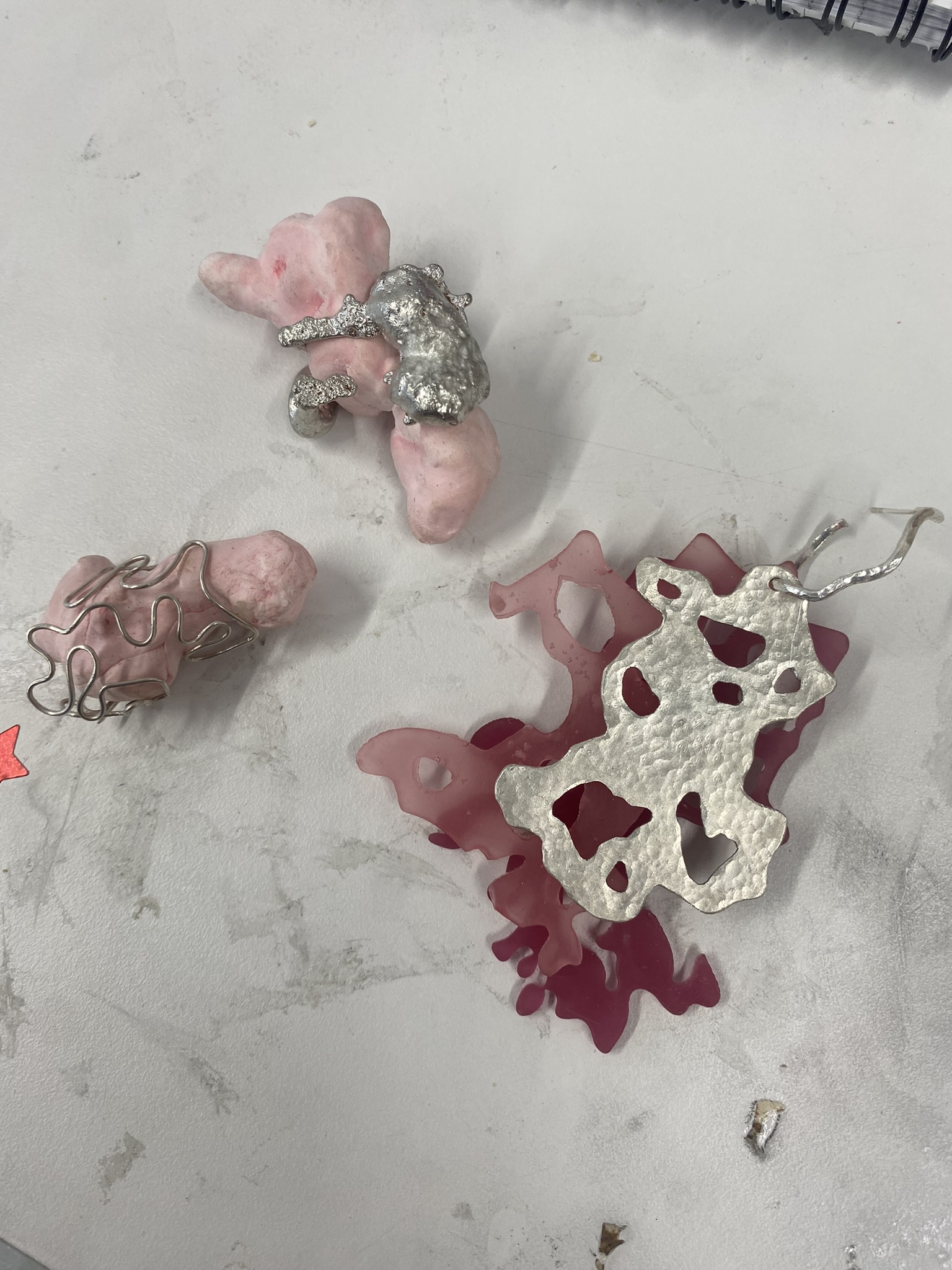 I really enjoy using alternative materials and figuring out the best techniques for them, but I also love more traditional jewellery materials and techniques, like silver, aluminium, casting, riveting and saw piercing, so I have played around with all of these different materials and techniques and tried to figure out what’s best for me and my project. I see all of these pieces as development, even if I’ve not continued with them, because I had to make something bad to know that it doesn’t work and so I can figure out how to make something better. There are never failures in art and design, only happy mistakes that can be worked on.